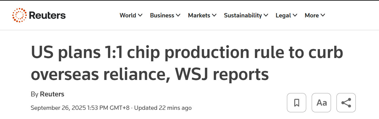 图:路透社相关报道:美国计划 1:1 芯片生产规则以遏制海外依赖